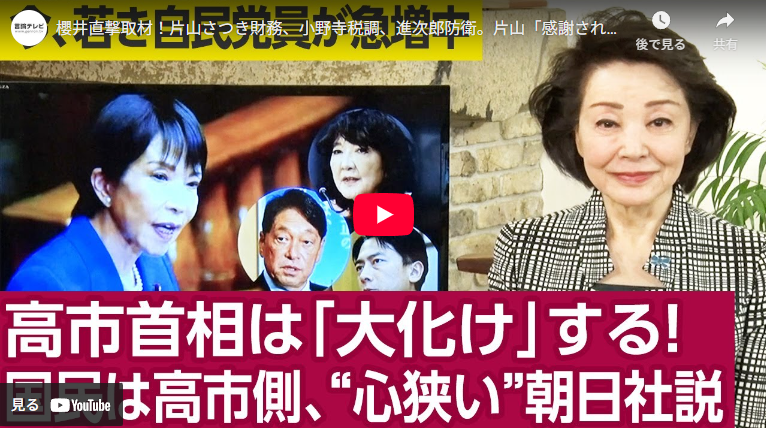 櫻井直撃取材!片山さつき財務、小野寺税調、進次郎防衛。片山「感謝される財務省になれ」。高市見事!安倍政権に似た強力官邸人事。すでに終わった!朝日新聞などオールドメディア。