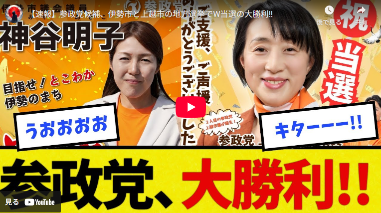 【速報】参政党候補、伊勢市と上越市の地方選挙でW当選の大勝利!!