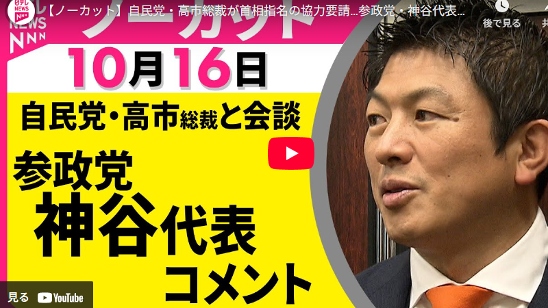 【参政党・神谷代表】自民党・高市総裁が首相指名の協力要請
