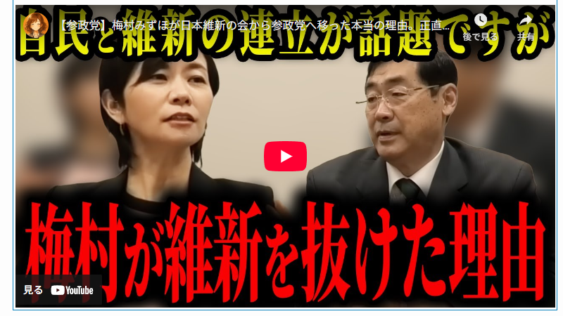 BeforeAfter https://youtu.be/7UV62h6t5ZU?si=iAklRSD7PafVxCyF 梅村みずほ議員が参政党へ移籍した理由と政界の動き 動画の概要 この動画は、日本維新の会から参政党へ移籍した梅村みずほ議員が、移籍の経緯と参政党の特徴について語ったインタビューです... -